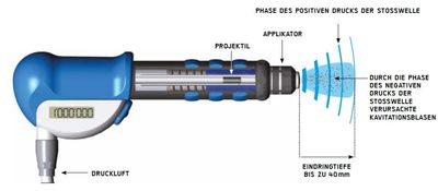 Compressed air accelerates a projectile that hits a fixed applicator at high speed (up to 90 km/h). The kinetic energy is converted into a shock wave, which then penetrates radially into the target tissue. This energy creates cavitation bubbles in the tissue, which start the healing process in the damaged tissue.